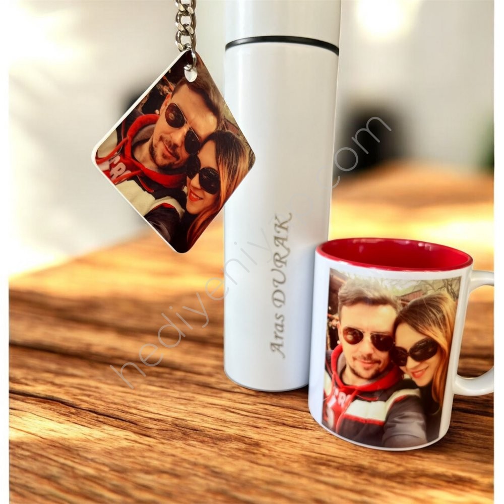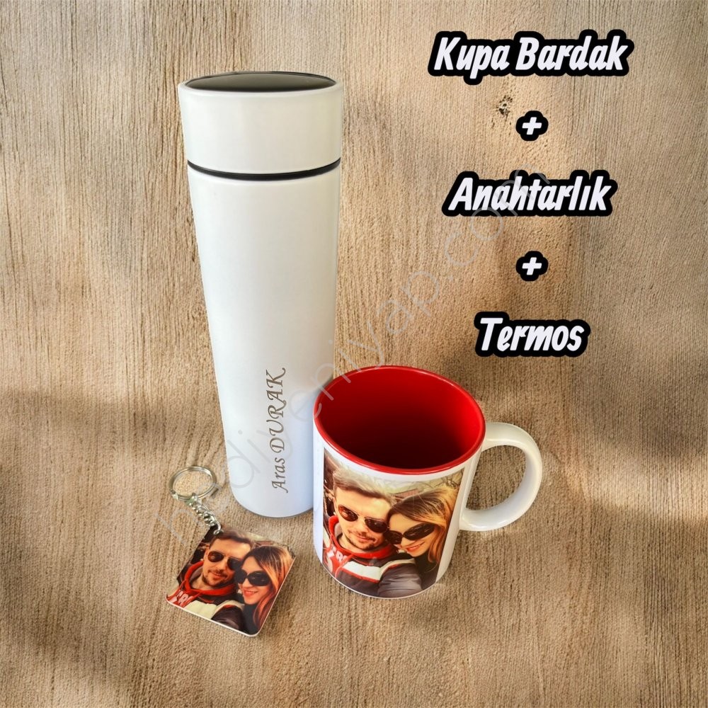 Ürün 1 adet isim yazılı termos, 1 adet kupa bardak ve 1 frp anahtarlıktan oluşmaktadır.