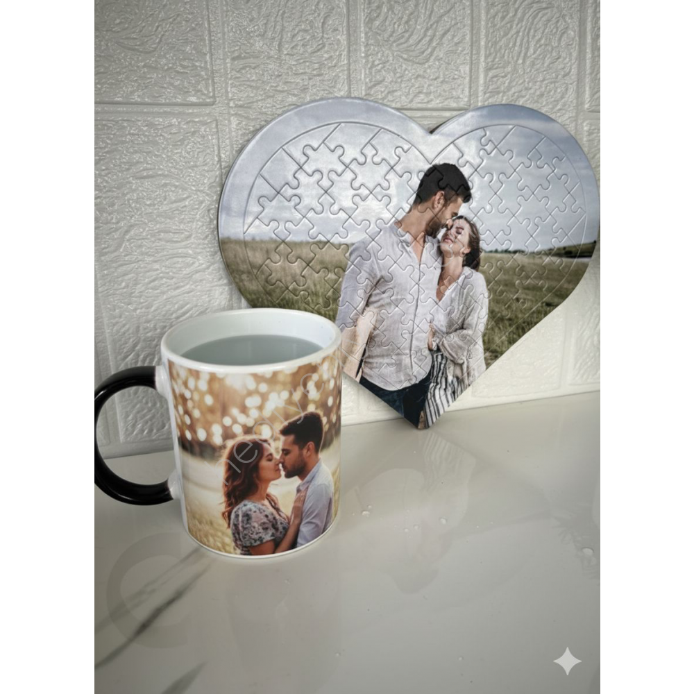 Kişiye Özel Resimli Kalp Puzzle + Sihirli Kupa Bardak